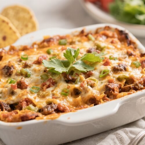 This casserole captures taco-night flavor without tortillas or beans. The base is a savory blend of eggs, cream, and cheese that sets into a soft, quiche-like layer.