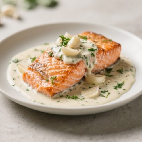 Salmon in a silky garlic cream sauce feels like restaurant food but is surprisingly easy to make at home. This version skips the heavy carbs and leans on simple ingredients you probably already have. It’s rich without being too heavy, and the garlic brings warm, cozy flavor that pairs perfectly with tender salmon.