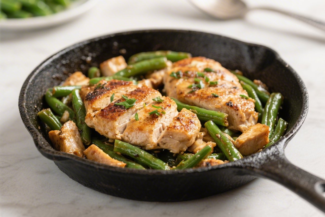Add beans and finish: Toss green beans in the sauce for 2–3 minutes until coated and crisp-tender. Return chicken and any juices to the pan.