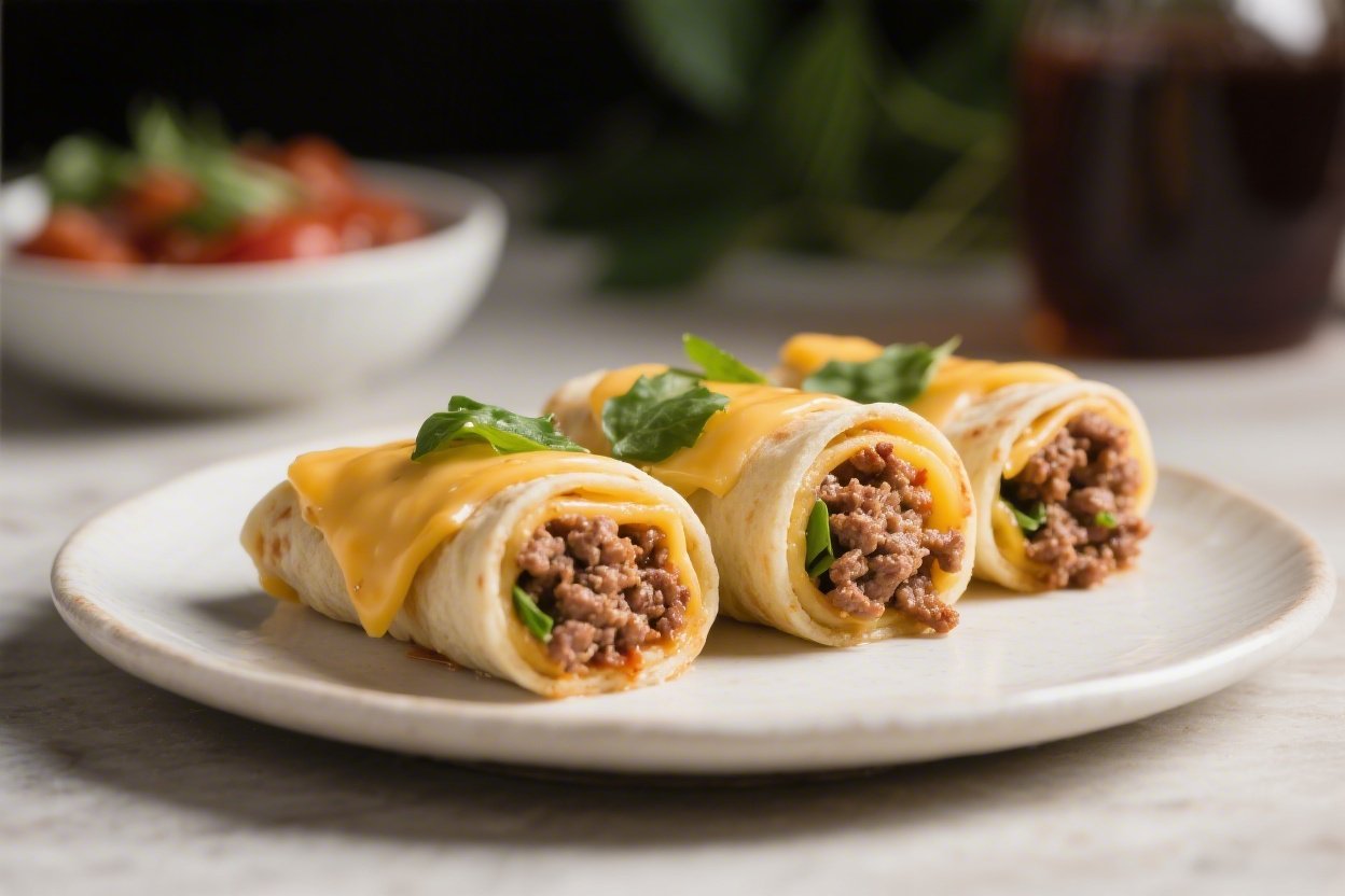 Fill and roll: Spoon 2–3 tablespoons of the beef mixture along the lower third of each cheese slice.