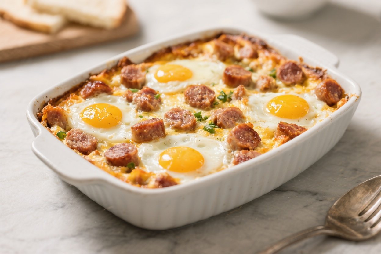 Combine and pour: Pour the egg mixture evenly over the sausage and cheese. Gently shake the dish to settle the eggs throughout.